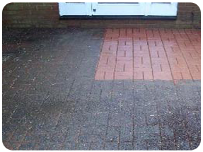 The picture on the right shows a block paved patio that apart from being an eyesore also presented a hazard. This 50/50 shot shows the cleaned part where the grime and slippery surface has been removed.